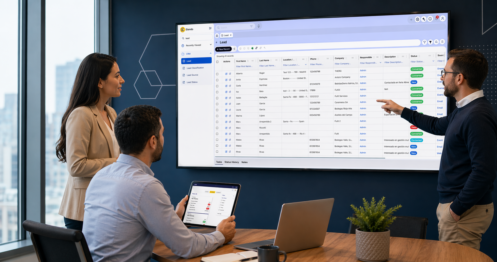 Para los equipos que ya trabajan en Etendo, tener el CRM en el mismo sistema que las ventas, el almacén y la facturación elimina la brecha de datos entre comercial y operaciones.