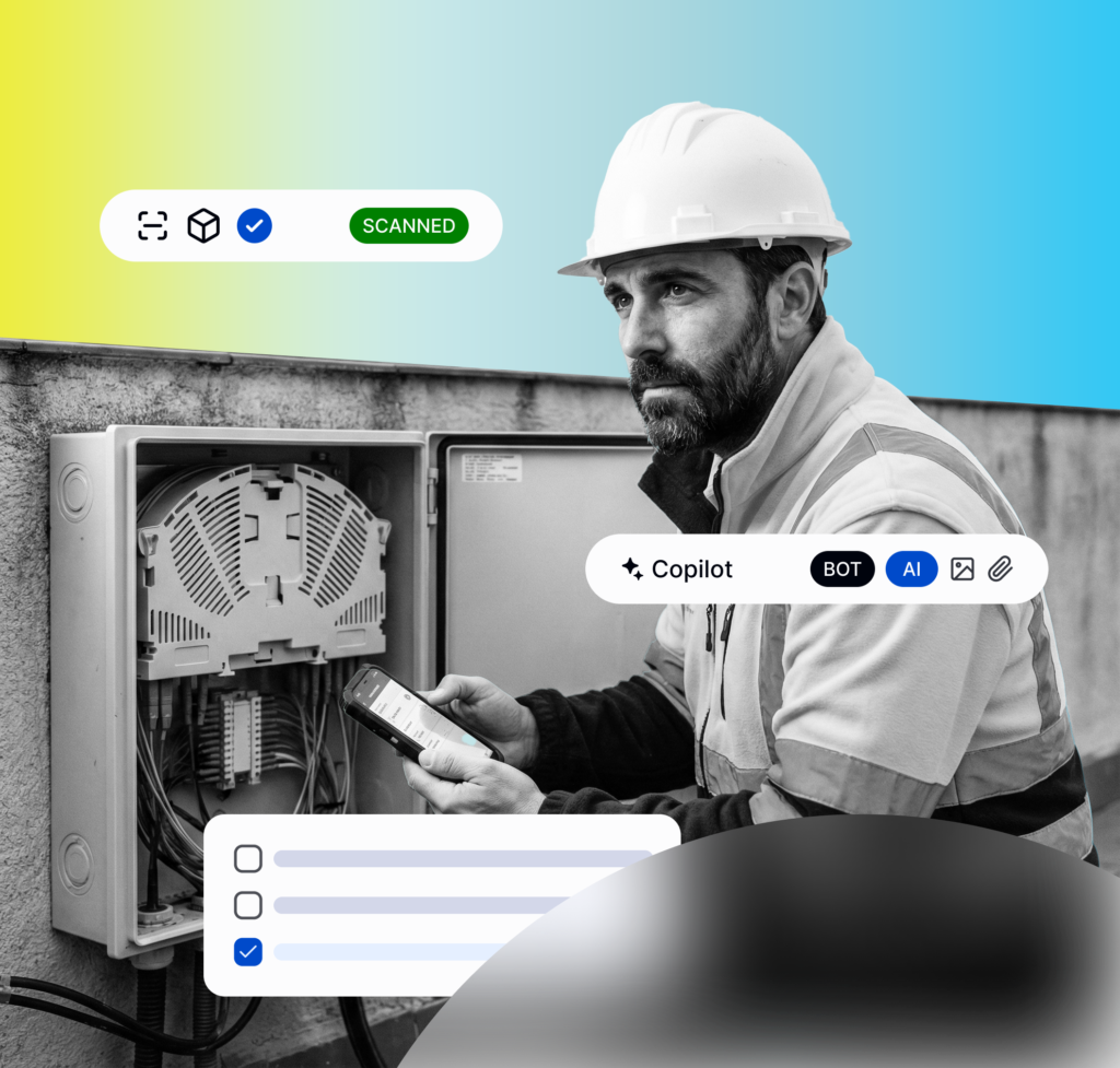 Órdenes de trabajo en tiempo real, carga de fotos, firma digital y geolocalización, confirmación de instalaciones y reparaciones, sincronización automática con el ERP.
